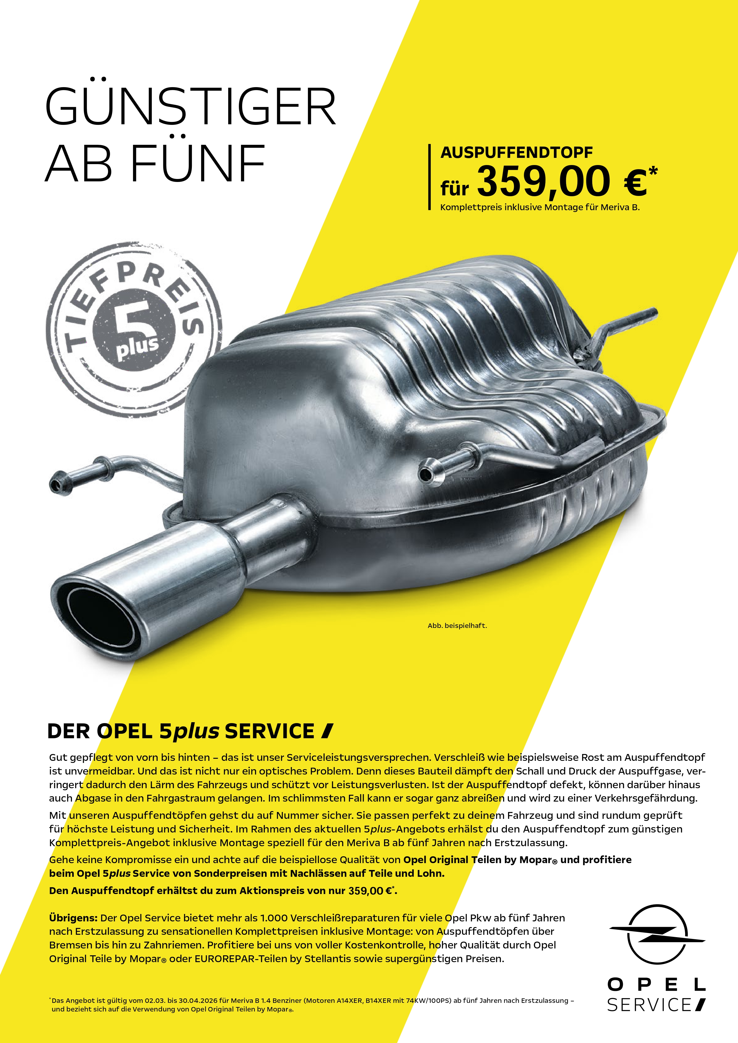 Opel 5plus Service behalten Sie die volle Kostenkontrolle. Für viele Opel Modelle ab 5 Jahren nach Erstzulassung bieten wir Ihnen damit attraktive Komplettpreise inklusive Montage für wichtige Verschleißreparaturen. So profitieren Sie von Sonderpreisen mit Nachlässen auf Teile und Lohn und Ihr Auto bleibt technisch top in Form.